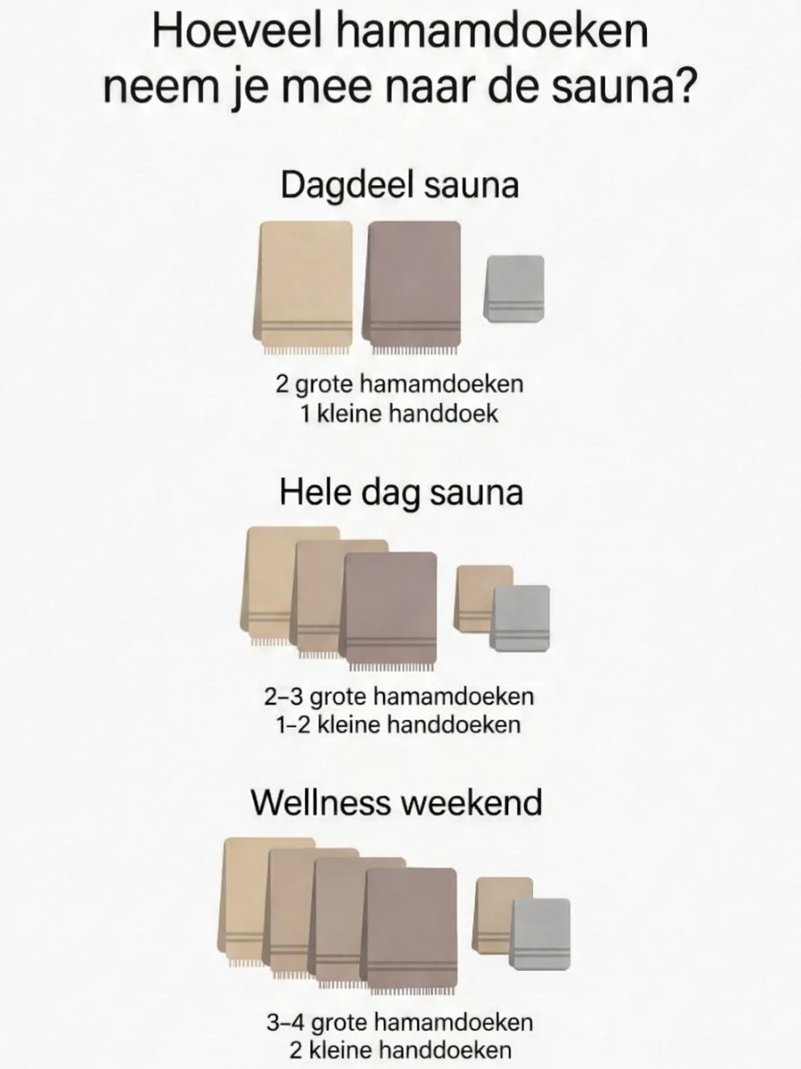 Een praktische richtlijn voor hoeveel handdoeken je meeneemt naar de sauna: bij een dagdeel zijn 2 handdoeken meestal genoeg (één om op te zitten of te liggen, één om af te drogen of te wisselen). Ga je een hele dag, dan is 3 handdoeken vaak prettiger. Voor een wellness weekend nemen veel mensen 3 tot 4 handdoeken mee, zodat je kunt rouleren.