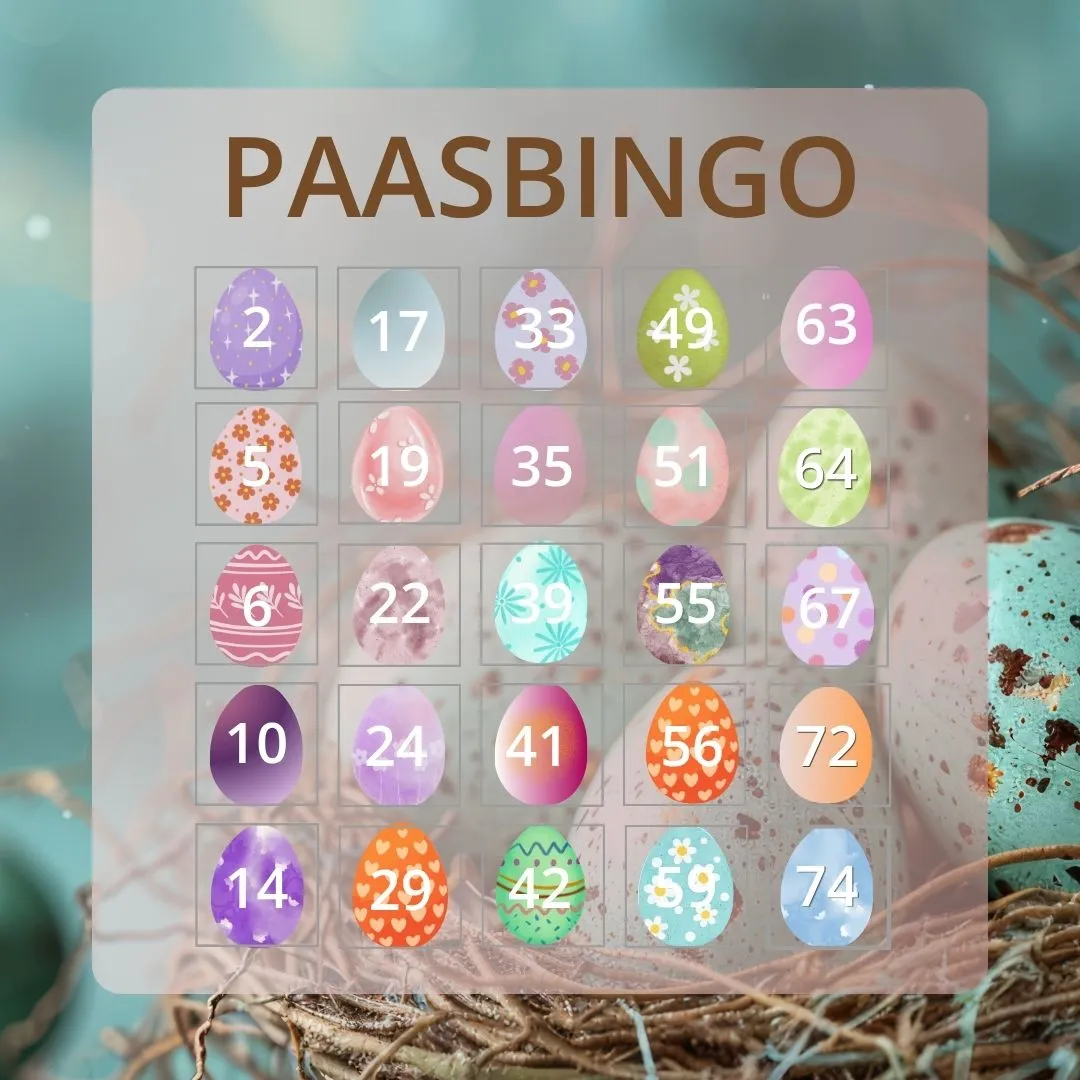 Op de bingokaart staan 25 vakjes. Tijdens de actie verschijnen de bijbehorende paaseieren verspreid op onze verschillende kanalen. Elk gevonden nummer helpt je verder richting een officiële bingo of zelfs een volle kaart.