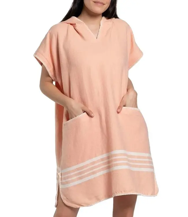 Poncho betekent 'rondom gesloten cape met opening voor het hoofd'. Deze poncho is gemaakt van hetzelfde materiaal als hamamdoek Krem Sultan. Naast een opening voor het hoofd heeft deze strandponcho ook een capuchon en zijn de armen gestikt. Hierdoor heeft de poncho een perfecte pasvorm en blijft heel goed op zijn plaats zitten. De modieuze farmer stitch maakt deze poncho een echt fashion item.